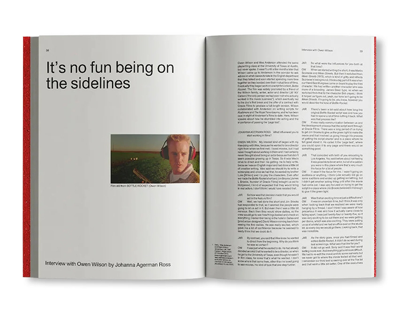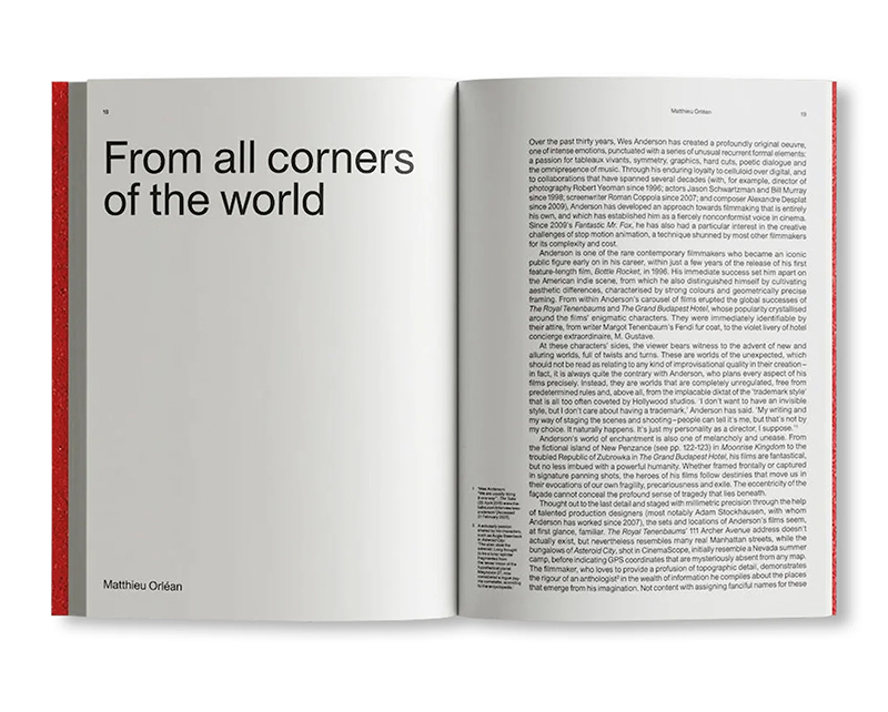 本書はそのような物語に捧げるものであり、作者の30年以上の映画活動の功績を称える一冊である。キャリアの初期から、ノート、ドローイング、絵画、ポラロイド、小道具、人形、セット、衣装など、作品にまつわる豊かな資料を保存してきており、この作品集に収められたそれらの資料は、オーウェン・ウィルソン(Owen Wilson)、ジェイソン・シュワルツマン(Jason Schwartzman)、スカーレット・ヨハンソン(Scarlett Johansson,)、ティルダ・スウィントン(Tilda Swinton)、作曲家アレクサンドル・デスプラ(Alexandre Desplat)、ミュージシャンのセウ・ジョルジ(Seu Jorge)、ミュージック・スーパーバイザーのランダル・ポスター(Randall Poster)といった長年の協働者たちによってさらに引き立てられる。